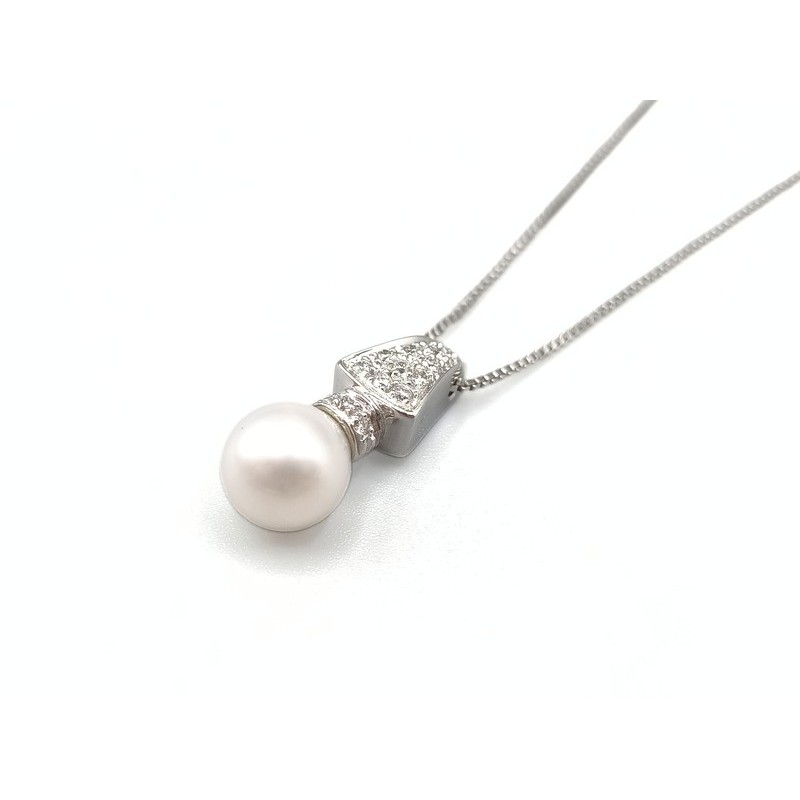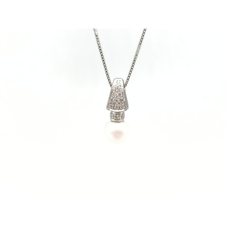 Pendente perla in oro bianco 18kt e brillanti G VS1. Dimensioni perla d'acqua dolce 7-7,5 mm. Collana veneziana in oro 18kt da 45 cm. L'articolo verrà spedito in confezione originale IL GIOIELLO DI PANI.