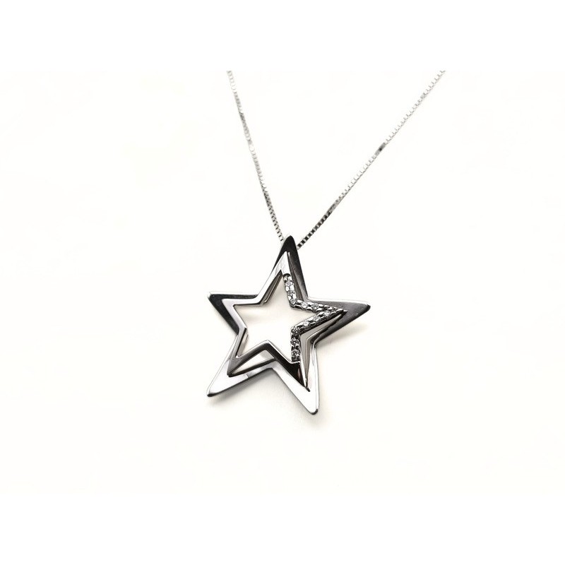 Pendente con stella in oro bianco 18kt con brillanti da 0,11ct. G color VVS.La collana con diamanti è un gioiello raffinato e prezioso ma anche versatile, creato affinché qualsiasi donna possa indossarlo con disinvoltura.L'articolo verrà spedito in confezione originale IL GIOIELLO DI PANI.