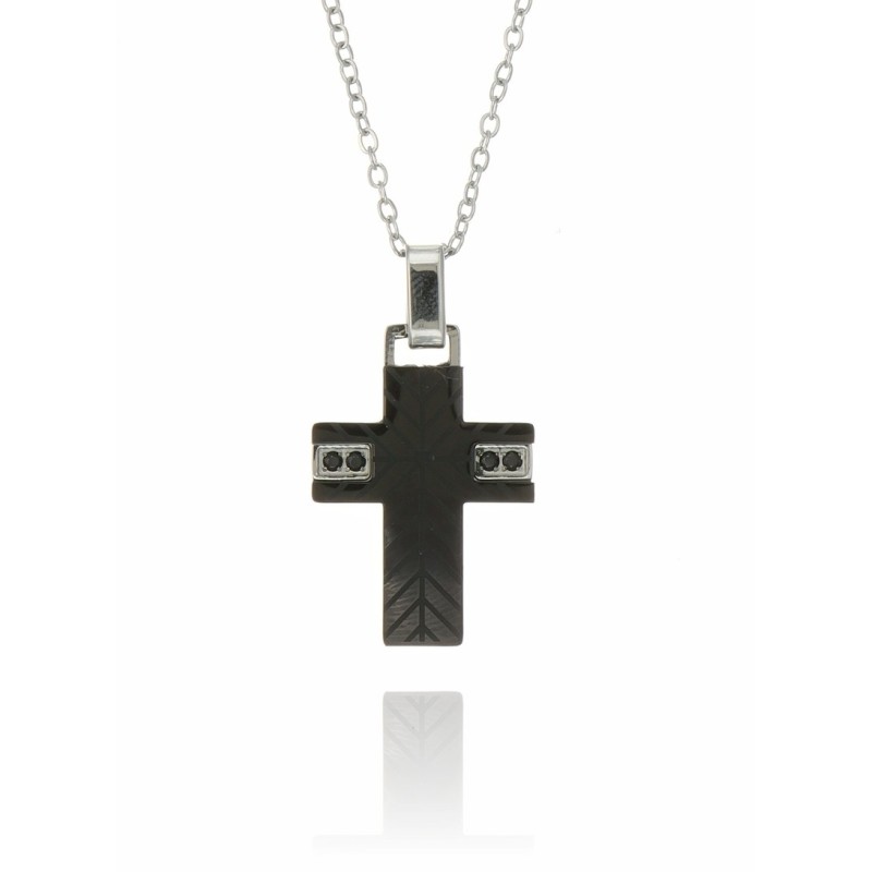 Collana pendente croce in acciaio con zirconi neri. Linea DETTAGLI X LUI. L'articolo verrà spedito in confezione originale IL GIOIELLO DI PANI.