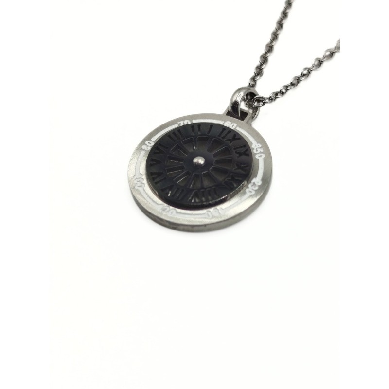 Collana in acciaio con elemento tondo nero e numeri romani. L'articolo verrà spedito in confezione originale IL GIOIELLO DI PANI.