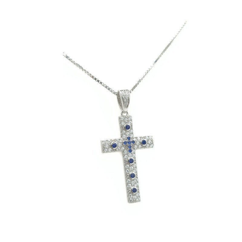 Pendente croce in Argento 925/°°° con zirconi naturali e veneziana da 45 cm - zirconi disponibili nei seguenti colori : bianchi , rossi, blu e verdi - Questo articolo viene spedito con il suo astuccio.