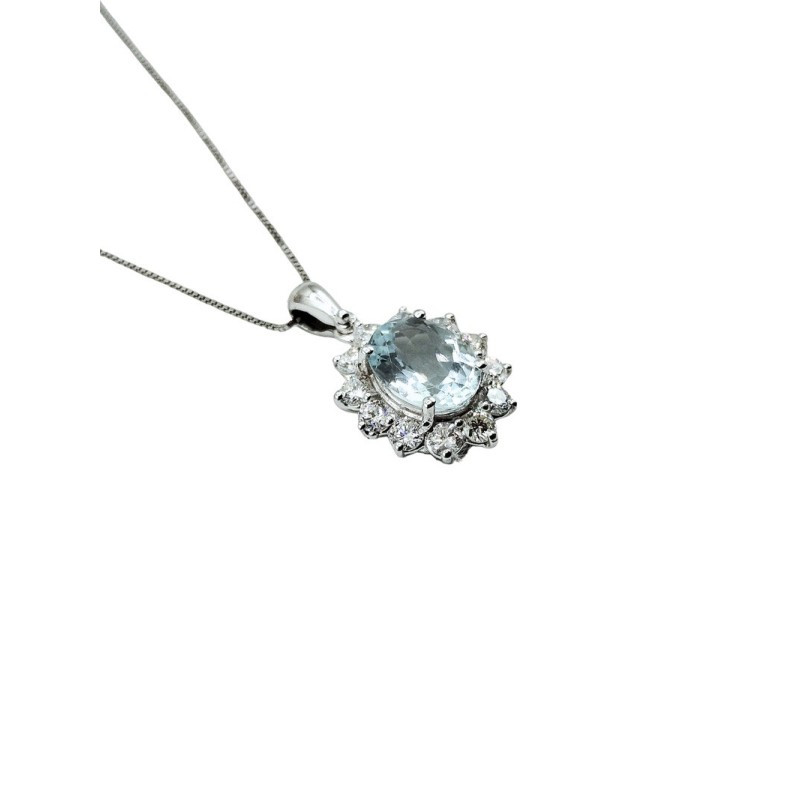 Collana in oro 18kt con acquamarina naturale taglio ovale da 1,26 ct. e diamanti taglio brillante G VS 0,60 ct. Design elegante, materiali di qualità e una brillantezza che non passa inosservata. L'articolo verrà spedito in confezione originale.