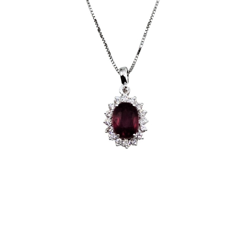 Collana in oro 18kt con rubino naturale taglio ovale 1,37 ct. e diamanti taglio brillante G VS 0,23 ct. Un accessorio essenziale che dona armonia e leggerezza a ogni outfit. L'articolo verrà spedito in confezione originale.