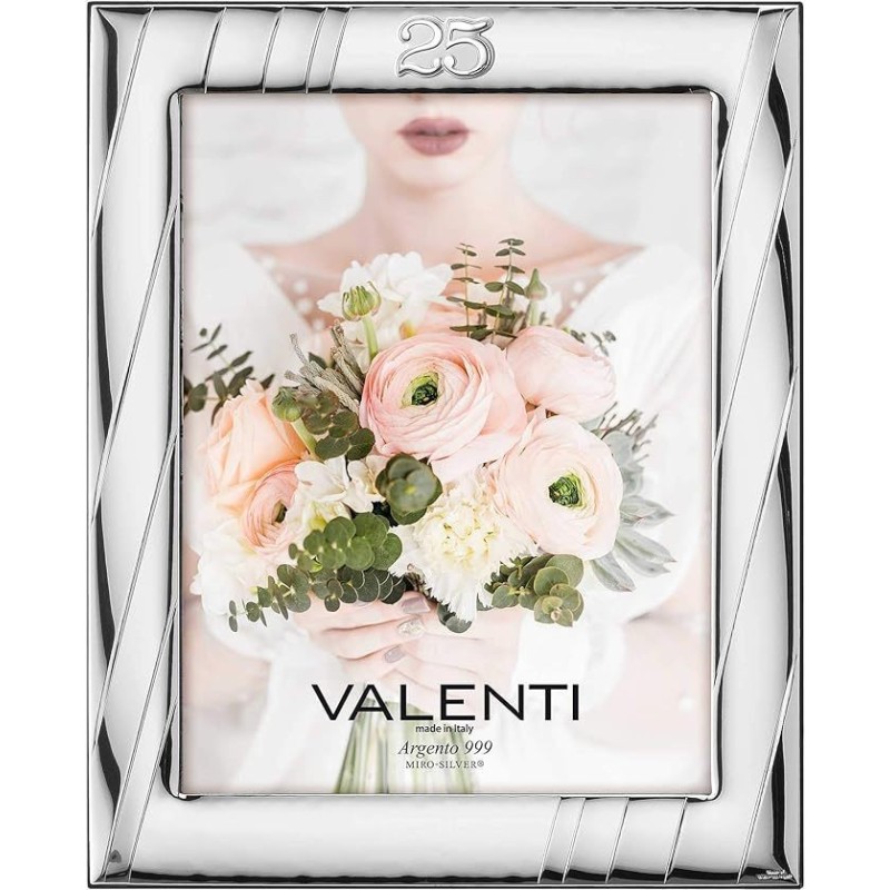Cornice portafoto di valenti. Cornice portafoto in argento laminato e retro in legno. Ideale per nozze d'argento. Le dimensioni sono 15x20 cm. Questo articolo verrà spedito con scatola originale Valenti Argenti.