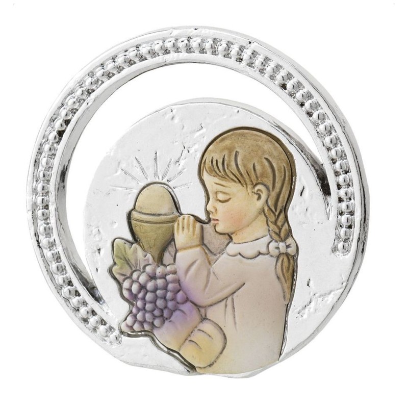 icona sacra di bagutta. sacro tondo in resina argentata dell'altezza di 6,5cm con contorno puntellato. raffigurata bambina 1° comunione . l'icona è dotata dell’apposito astuccio personalizzato.