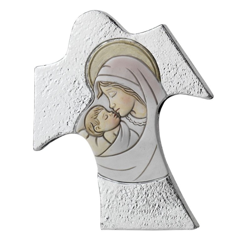 icona sacra di bagutta. sacra croce stilizzata in resina argentata dell'altezza di cm 11. raffigurati madonna con bambino . l'icona è dotata dell’apposito astuccio personalizzato.