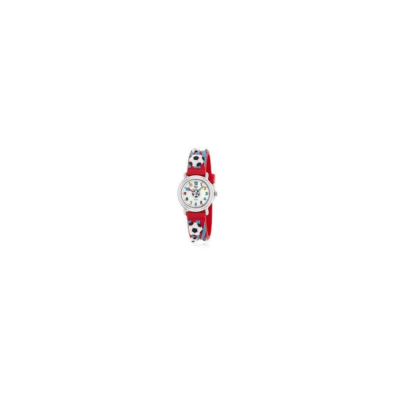 Orologio da polso per bimbo Marea, il cinturino è realizzato in silicone rosso con motivi calcistici e chiusura con fibbia, resistente all'acqua.