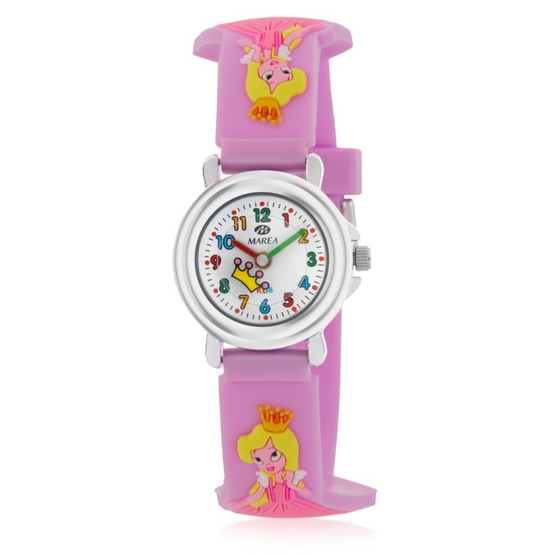 Orologio da polso analogico bimba Marea, con cinturino in gomma rosa e rilievi con principesse, resistente all'acqua. Ideale da regalare nei primi anni di infanzia. Questo articolo verrà spedito con scatola originale Marea.