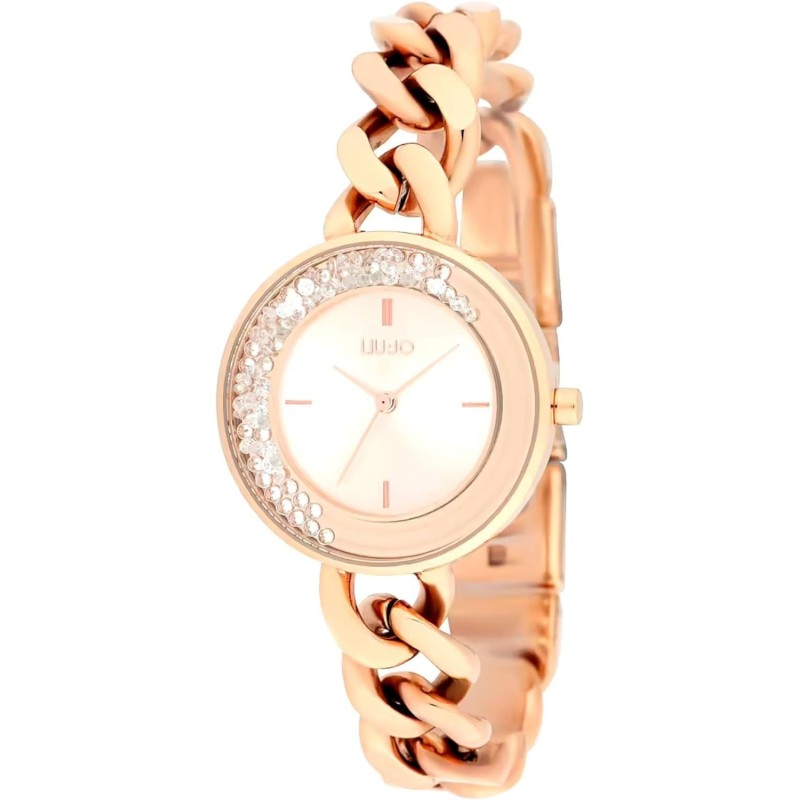 Orologio da donna solo tempo di Liu Jo della collezione Dancing Chain realizzato con cassa in acciaio ip oro rosa del diametro di 32 mm con quadrante di colore rosè impreziosito da una ghiera di cristalli bianchi sotto il vetro che si muovono al movimeto del polso, con cinturino modello bracciale a catena in acciaio pvd oro rosa con chiusura a clip. La resistenza all'acqua è di 3 atm. Movimento al quarzo.Questo articolo verrà spedito con scatola originale LIU JO.
