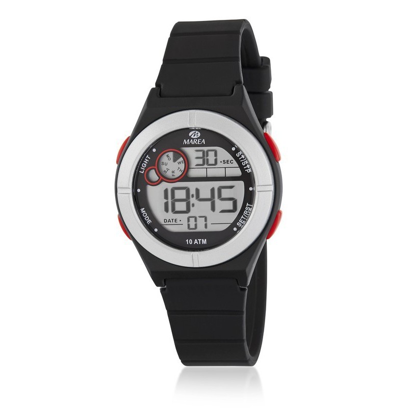 Orologio Marea Digitale per Bambini- Scatola di plastica nera- Cinturino in silicone nero- Sfera digitale- Lunetta grigia- Cronografo- Allarme- Conto alla rovescia- Luce- Calendario- Sommergibile 100m. Questo articolo verrà spedito con scatola originale Marea.